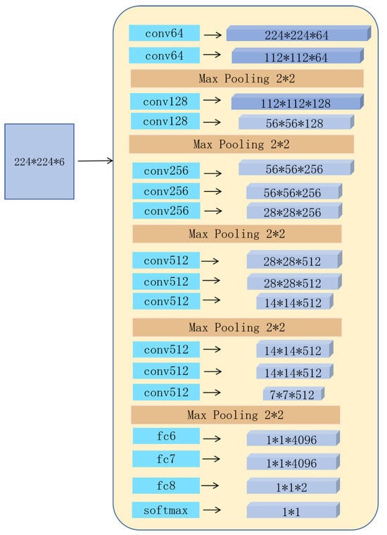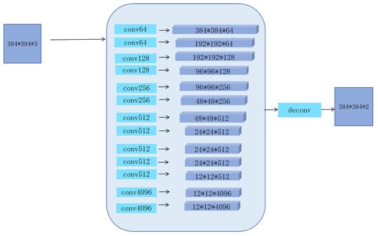 After the feature learning based on pixels and superpixels, we obtain two coarse saliency maps, respectively. In this part, we adopt a deep convolutional network to generate the final saliency map. Considering the comprehensive efficacy, we use a pre-trained VGG-16 as our basic network model. Network architecture is detailed in Figure 6. The key difference between our architecture and DNN lies in the input images, which is a six-dimensional dictator image with . The input images includes: the original RGB image, which is a three-dimension feature image, the two saliency maps based on pixels and superpixels, and the superpixel-segmented original image. The superpixel-segmented image is generated using the SLIC method (see Section 2.1.1). Specifically, we select the superpixel to be classified and mark it on a background. Next, we assign the maximum intensity to the pixels within the selected superpixel, while keeping all other pixels at zero intensity. Our network model can estimate the location of the salient regions with the two coarse saliency maps, while the superpixel indication image can accurately mark the superpixel for classification.