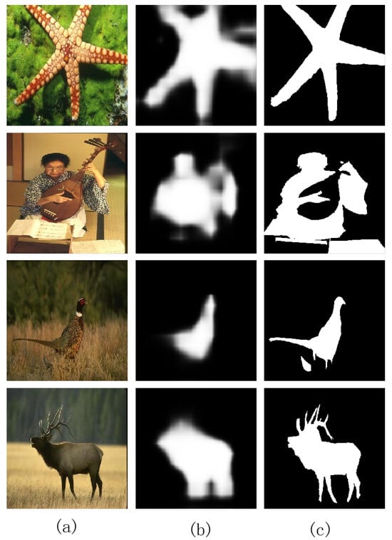 Output cases of the feature learning based on pixels. (a) Input images. (b) Saliency maps of the feature learning based on pixels. (c) Ground truth.