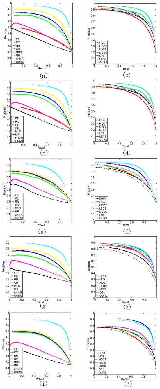 The five datasets’ precision–recall curve for our methods and compared methods. (a,b) HKU-IS dataset. (c,d) ECSSD dataset. (e,f) SOD dataset. (g,h) PASCAL-S dataset. (i,j) DUT-OMRON dataset.