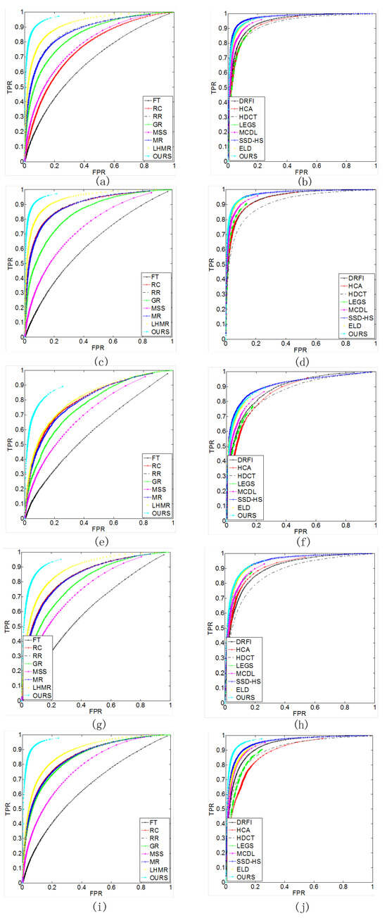 The five datasets’ roc curve for our methods and compared methods. (a,b) HKU-IS dataset. (c,d) ECSSD dataset. (e,f) SOD dataset. (g,h) PASCAL-S dataset. (i,j) DUT-OMRON dataset.