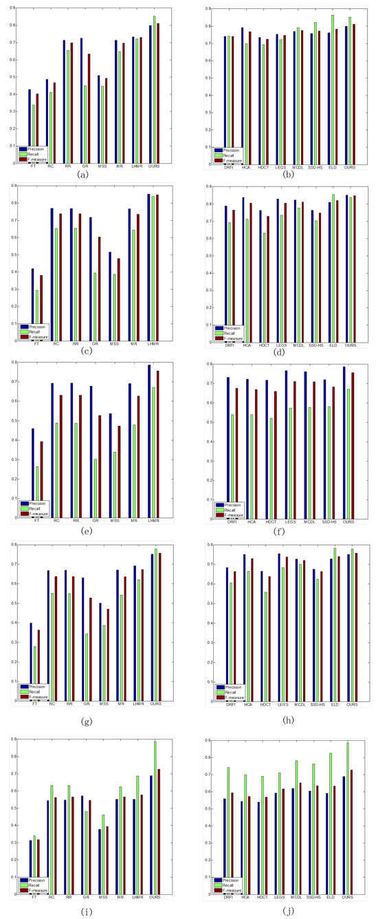 The average precision, recall, and F-measure of our method and state-of-the art methods on the five datasets. (a,b) HKU-IS dataset. (c,d) ECSSD dataset. (e,f) SOD dataset. (g,h) PASCAL-S dataset. (i,j) DUT-OMRON dataset.