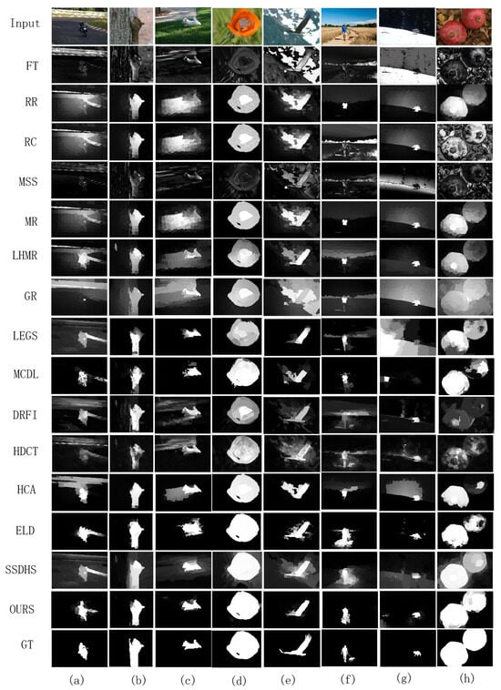 Saliency maps of the proposed method and against methods on five datasets. (a,b) The images with low contrast. (c–e) The images with complex background. (f,g) The images with small objects. (h) The image with two objects.