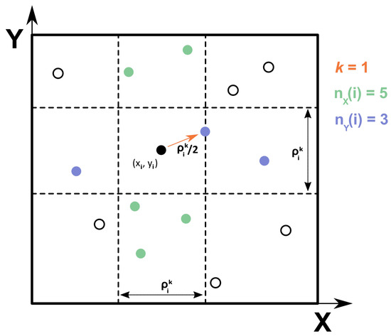 Determining , , and for a single pair in the algorithm for Equation (29). Adapted from Kraskov et al. [21].