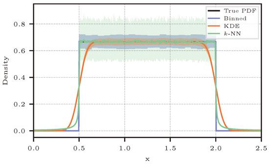 Introduced as the Parzen–Rosenblatt window method [24,25], the KDE method consists of estimating a PDF based on kernels as weights, with the kernel being a non-negative window function. The density at a point x is estimated as: