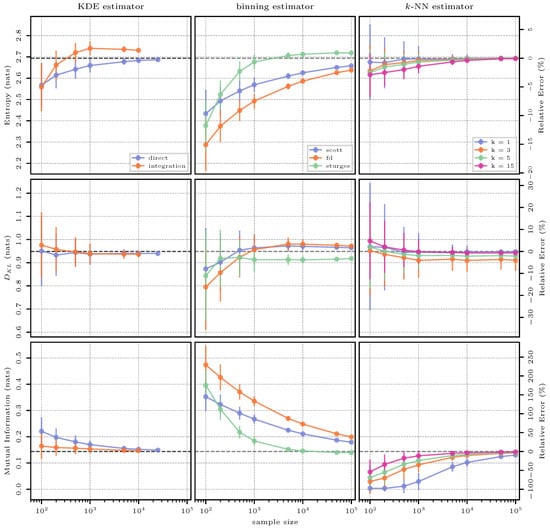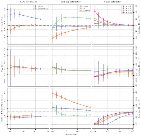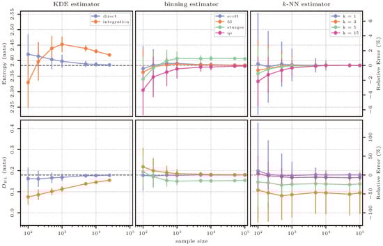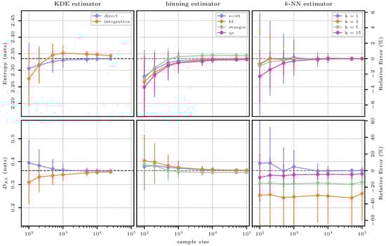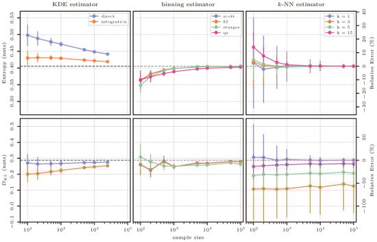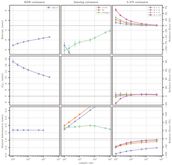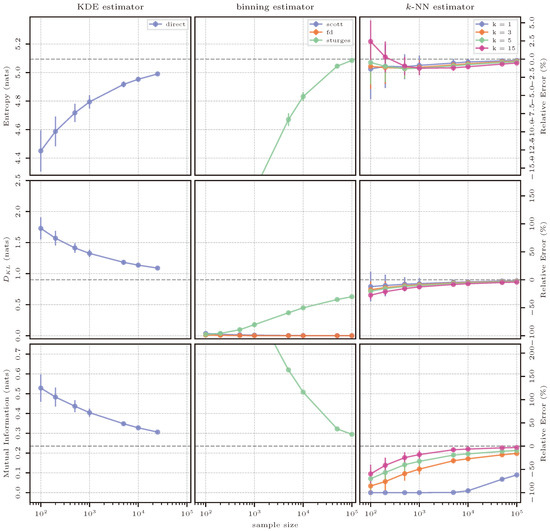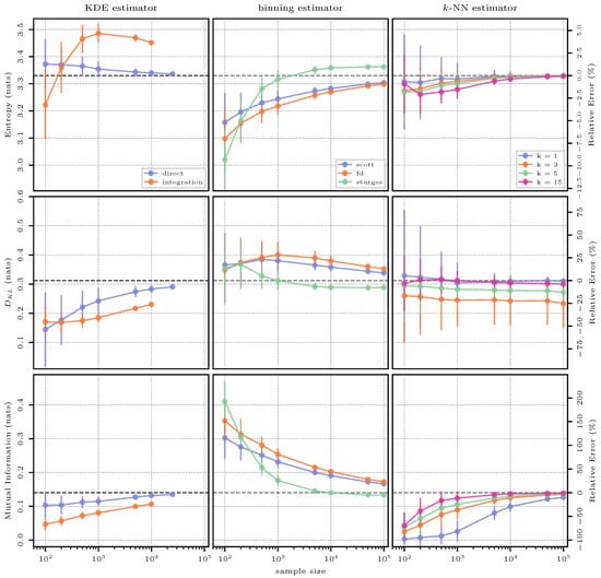 k-NN-based estimation continues to perform well, but the challenges of estimation in higher dimensions also affect the results based on this method. Here, the number of samples was also limited from the typical 100,000 as the maximum evaluated to 50,000. Although not as markedly as with other methods, the computational cost increased from seconds to minutes in comparison to the previous four-dimensional case, even considering that the number of available samples was restricted. Notably, the estimator gives a much more accurate result for entropy across all sample sizes than KDE or binning for the largest implemented sample size, using the k-NN hyperparameter . For KL divergence and mutual information, the performance is not as accurate, even when considering an optimal choice of hyperparameters. For KL divergence, estimates using show a downward trend, which would suggest that the estimator will eventually converge, but at a much higher number of available samples. The same is true for mutual information using . However, the relative errors of both quantities are much smaller than those produced by KDE or binning and remarkably similar in order of magnitude to all lower-dimensional test cases.