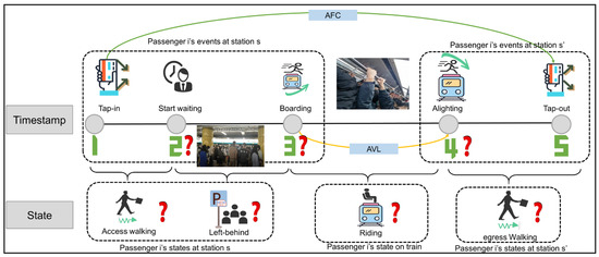 where, the events of tap-in , waiting for boarding , boarding , alighting , and tap-out are represented in sequential order.