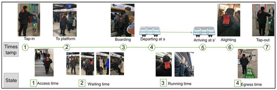 where, represents the state of an individual at different spatial locations of the origin station , train , and destination station , respectively. The value of the total time at the origin station is calculated by summing the access time and the waiting time . denotes the running time on the train and indicates the egress time at the destination station. An individual trajectory can be represented as follows: