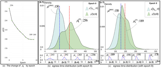 Figure 10a depicts the variation of value across iterations, with the horizontal axis representing the number of iterations and the vertical axis indicating changes in value and pdf of the latent variable , taking the D2 data set as an example (unit in second). Figure 10b,c display PDF distributions of the initial 0 and final iteration 9, respectively. The pdf distribution based on is represented by a blue-filled curve, while that based on is depicted with a green-filled curve. The blue vertical line represents the acquired prior value (), serving as a reference for parameter variation, whereas the red vertical line indicates the current iteration round’s value . It can be observed that the prior value exhibits left-skewness, which decreases from to , after learning through UA module and stabilizes thereafter. Notably, Figure 10(b.2–b.5) and 10(c.2–c.5) demonstrate different PDF distribution shapes of vectors at various position indexes (from left to right: T1–T4), corresponding to the first and last rounds, respectively. Evidently, as iterations increase, they tend to align more closely with .