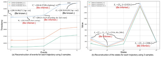 2. Calculate unknown events and state variables. Figure 3c illustrates the trajectory inference process, indicating that the egress time of the passenger is . Subsequently, the individual’s train ID is determined as follows: