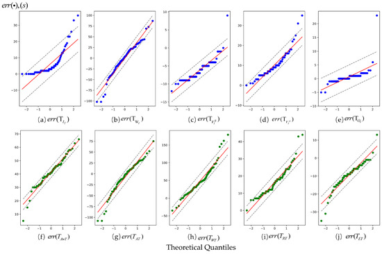 Figure 12 employs Q-Q plots to demonstrate the normality of each event-time variable. The horizontal axis represents theoretical quantiles of the probability distribution, and the vertical axis reflects percentiles of residual values. The red line represents the regression line satisfying either (in Figure 12a–e) or (in Figure 12f–j). Two grey dashed lines indicate a 95% confidence interval, with individual residual denoted by points on the plot.