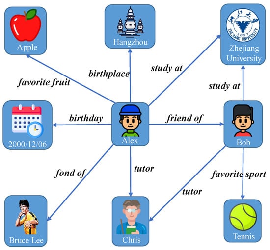 In addition to characterizing the KPIs of semantic communication, the representation of semantic information is also a challenging aspect of semantic communication [20]. Although many approaches use auto-encoders for semantic compression [21,22,23], resulting in data of a small size that are considered to be semantic information, this output often lacks interpretability and cannot be directly validated by interaction with human understanding. To address this limitation, some works [24,25] proposed the use of knowledge graphs as a representation method aligned with human logic. A knowledge graph generally consists of a set of nodes connected by edges [26]. Each node represents an entity, which can be a real-world object, a concept, a temporal reference, etc. The edges represent the semantic relationship between these entities. An illustrative example of a knowledge graph is shown in Figure 1. Notably, knowledge graphs efficiently encapsulate substantial information within a compact data size, making them an ideal candidate for semantic information representation.