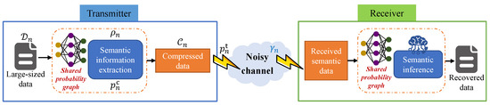 Within the framework of the considered PSC network, each user possesses a personalized local probability graph that stores statistical information about their historical data. Each user n individually performs semantic information extraction, compressing original large-sized data based on its stored probability graph, with the semantic compression ratio denoted by . Subsequently, the obtained compressed data, , are transmitted to the BS with transmit power . Meanwhile, the BS maintains identical probability graphs corresponding to all N users. Once the BS receives the semantic data from user n, it conducts semantic inference to recover the compressed semantic information using the shared probability graph of user n. The overall framework of the considered PSC network is depicted in Figure 4.