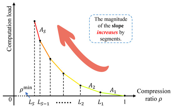 Based on (7), the computation load, denoted by , exhibits a segmented structure with S levels, and the slope magnitude decreases in discrete segments, as depicted in Figure 5. This is because when the compression ratio is high, only low-dimensional conditional probabilities are employed, resulting in lower computational demands. However, as the compression ratio decreases, the need for higher-dimensional information arises. With higher information dimensions, the computation load becomes more intensive. Each transition in the segmented function represents the utilization of probabilistic information with more information for semantic information extraction.