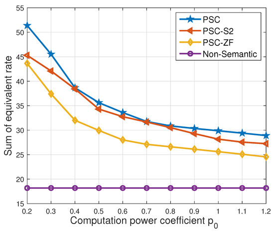 In Figure 9, the relationship between the sum of the equivalent rate and the computation power coefficient is depicted. Notably, the ‘non-semantic’ scheme maintains a constant sum of the equivalent rate across different values due to its lack of utilization of semantic communication techniques, consistently exhibiting the lowest performance among the considered schemes. As the computation power coefficient decreases, the sum of the equivalent rate for the other three schemes increases. This trend is attributed to the enhanced efficiency in computation with a lower , facilitating a lower semantic compression ratio. Consequently, a higher sum of the equivalent rate is achieved. It is found that the ‘PSC-S2’ scheme exhibits variable proximity to the ‘PSC’ scheme, illustrating a dynamic relationship. A small gap between the two indicates that the solution of the ‘PSC’ scheme closely aligns with the midpoint solution of the ‘PSC-S2’ scheme. Moreover, the sum of the equivalent rate for the ‘PSC-S2’ scheme demonstrates a segmented function concerning the computation power coefficient . This behavior arises because the solution of the ‘PSC-S2’ scheme jumps to the midpoint of another segment of the computation load function only when changes significantly.