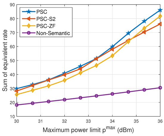 In Figure 10, the evolution of the sum of the equivalent rate is traced across varying maximum power limits. A consistent upward trajectory is observed for all schemes as the maximum power limit increases. This behavior is a direct consequence of the positive correlation between augmented power levels and increased achievable rates for all users. Distinctly, in comparison to the ‘non-semantic’ scheme, the advantages of the ‘PSC’ scheme become more pronounced with higher maximum power limits . This enhancement can be attributed to the ‘PSC’ scheme’s ability to allocate more power to semantic compression as the maximum power limit increases. The reduction in data size achieved through semantic compression significantly contributes to the overall sum of the equivalent rate. Conversely, the ‘non-semantic’ scheme can only allocate all power to transmission, which does not contribute as significantly to the sum of the equivalent rate. Consequently, the proposed ‘PSC’ scheme exhibits substantial superiority when there is sufficient power.