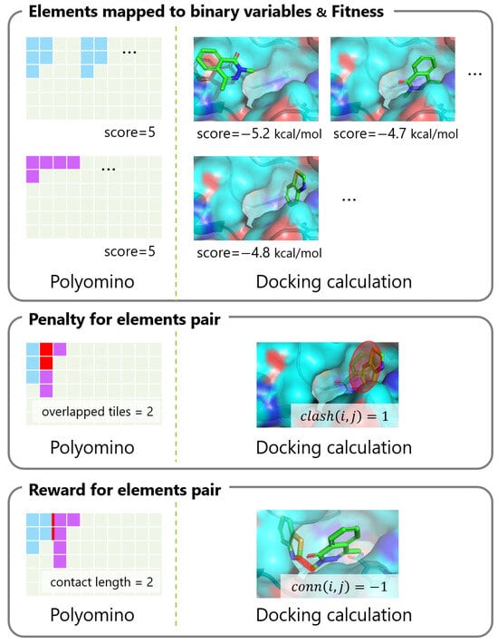 In Section 2.1, we itemized the factors that should be considered when formulating a fragment-based docking calculation for the QUBO problem. Some of these factors have similarities to the Hamiltonian presented by Takabatake et al. [] in their approximation of the protein–compound docking calculation as a generalized polyomino puzzle. Table 1 and Figure 1 show the comparisons between the polyomino puzzle and the docking calculation when modeled as a QUBO problem.