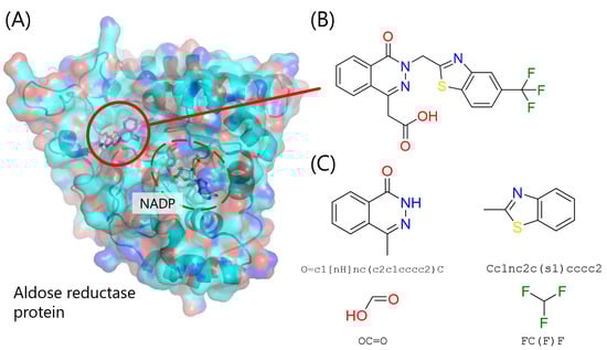 The complex structure of aldose reductase (ALDR) and its inhibitor. (A) A molecular complex formed by the target protein coupled to small molecule: the cofactor NADP and inhibitor. The protein is represented by a molecular surface with the backbone atoms traced, and the cofactor NADP and inhibitor are shown as sticks. Proteins and small molecules are shown in colors based on the element of the atoms: the oxygen and nitrogen atoms are colored red and blue, respectively; the carbon atoms of the protein and cofactor are indicated in blue; and the carbon atoms of the inhibitor are indicated in purple. (B) Structural formula of the inhibitor compound. (C) Fragments decomposed from the inhibitor with SMILES (simplified molecular input line entry system), which is a linear notation for describing the structural formula of compounds.