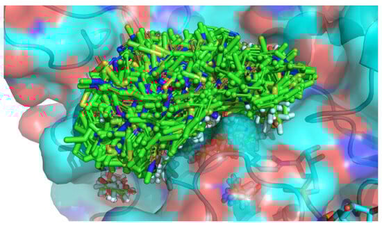 Overall, 3005 candidate fragment placements were obtained by fragment docking based on the procedure described in Section 3.2. All fragment placements are superimposed in Figure 4. Fragment placements were spread over the entire pocket space of the ALDR owing to the division of the binding pocket region into 343 subregions.