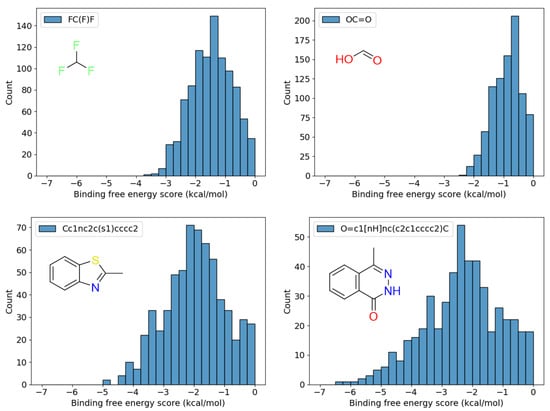 Histograms of binding free energy scores for each of the four constituent fragments.