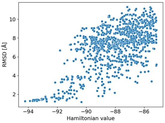 The scatter plot of the Hamiltonian values and the RMSD with corresponding docked poses to the co-crystallized compound structure. Only the top 1000 local solutions are shown.