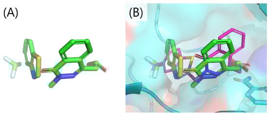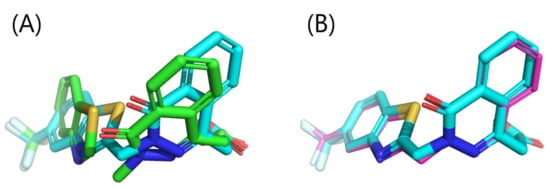 The compound structure after energy minimization. (A) Comparing the structure before and after energy minimization. (B) Comparing the structure after energy minimization with the co-crystallized structure. The fragments and small molecules are shown as sticks in colors based on the element of the atoms: the oxygen and nitrogen atoms are colored red and blue, respectively; the carbon atoms of the structure before energy minimization are indicated in green; the carbon atoms of the structure after energy minimization are indicated in cyan; and the carbon atoms of the co-crystallized structure in purple.