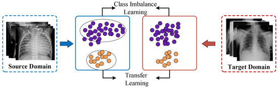 The Radiological Society of North America (RSNA) pneumonia detection challenge dataset [38] is divided into two stages, starting with the release of a training set containing 25,684 radiographs and a test set containing 1000 radiographs from the ChestX-ray14 dataset [39]. All radiographs are in an anonymized DICOM format, with a resolution of pixels and an 8-bit depth. The training images were labeled by non-thoracic radiologists affiliated with RSNA, while the test images were labeled by specialist thoracic radiologists from the Society of Thoracic Radiology. The dataset contains 6011 cases of pneumonia and 20,672 other cases, including normal and other diseases. The distribution of classes is imbalanced, with a ratio of approximately 0.25:1. It is worth noting that our proposed DTTL model is trained using this dataset as the source domain.