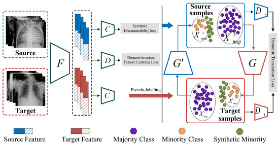 where denotes the k-th element in the predicted probability vector. After that, the majority and minority classes can be separated from target domain, represented by and , respectively, such that the target dataset is represented by .