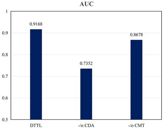 This section assesses the influence of the Cross-domain Minority class Translation (CMT) module on the efficacy of Dynamic Weighting Translation Transfer Learning (DTTL) framework. The study employs the key performance metric of Area Under the Curve–Receiver Operating Characteristic (AUC-ROC) to measure the contribution of the CMT module to the overall effectiveness. Comparative analysis between DTTL configurations with and without the CMT module indicates a significant performance enhancement when the module is integrated. Notably, the DTTL equipped with the CMT module achieves an AUC-ROC score of 0.9168. In contrast, the AUC-ROC score diminishes to 0.8678 in the absence of the CMT module, as depicted in Figure 4.