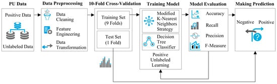 Figure 1 shows an outline of the suggested method, in which a positive unlabeled dataset is ready to be processed for cleaning data, engineering features, transforming data, and other alternative preparation phases if required. The dataset undergoes 10-fold cross-validation, where it is randomly segmented into ten folds. One fold is reserved for testing while the remaining nine folds are used for training. This process is iterated 10 times to evaluate the classifier’s performance and compute the average classification rate. In the training step, the concept of PUL, based on the nearest neighbors strategy and decision tree classifier, is integrated to construct the core of the NPULUD method. Afterward, the evaluation will be conducted using different criteria like accuracy, recall, precision, and F-measure. This assessment will involve using the test set to make predictions. The predictive model will classify instances into positive and negative categories.
