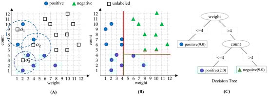Following the labeling of unlabeled instances using the modified KNN approach, we used a decision tree classification algorithm to build a classifier. The algorithm learns from the labeled instances. By leveraging the decision tree’s ability to capture complex decision boundaries and interactions among features, it is supposed to achieve enhanced classification performance compared to the initial labeling step. As shown in Figure 2C, the decision tree splits instances based on their weight attribute. If the weight is greater than 4, the tree further splits based on the count attribute. Similarly, if the count exceeds 4, the instance is identified as negative, and otherwise, as positive. If the weight is 4 or less, the tree directly classifies based on the number of positive instances. Also, if the count is less than 4, the instance is regarded as positive. This decision tree offers a straightforward classification process using weight and count features, facilitating the effective classification of instances in PU data.