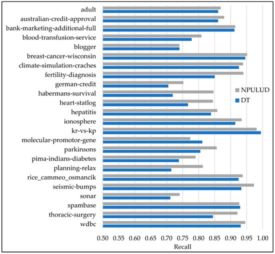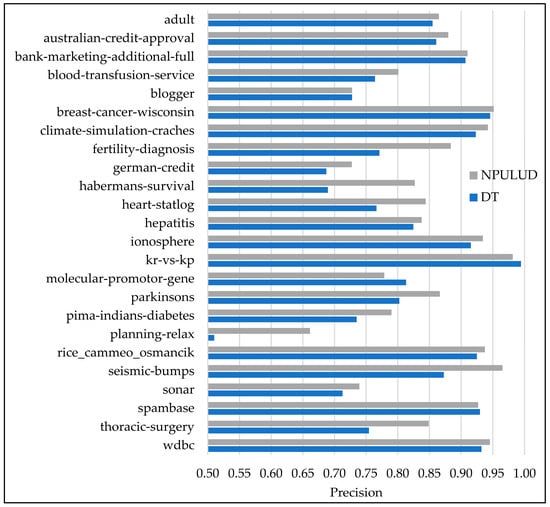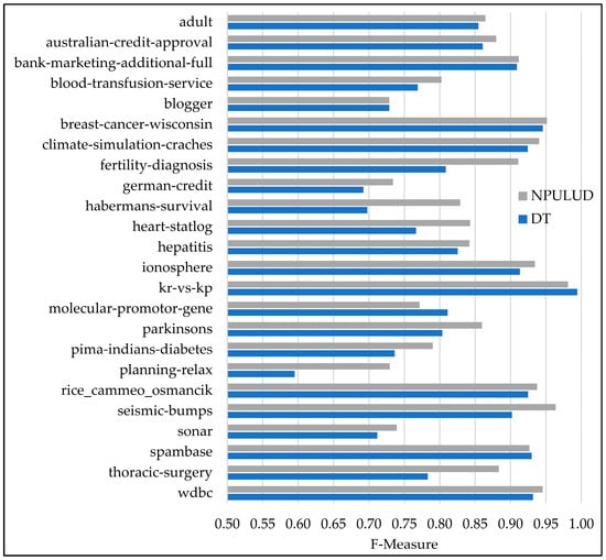 In Table 5, the comparison between the DT and NPULUD methods based on accuracy metric has been previously detailed. Here, we focus on results based on precision, recall, and F-measure metrics represented in Figure 3, Figure 4 and Figure 5, respectively. The NPULUD method consistently surpasses DT across all 24 datasets with averages of 0.8572, 0.8724, and 0.8625 in precision, recall, and F-measure metrics, respectively, in comparison with DT method with averages of 0.8175, 0.8399, and 0.8259 in precision, recall, and F-measure metrics, respectively. Moreover, NPULUD outperforms DT in all the mentioned metrics in 20 out of 24 datasets when comparing results from each dataset. For instance, in the “seismic-bumps” dataset, NPULUD achieves a high precision of 0.9652, outperforming DT, which achieves 0.8727. Conversely, in the “planning-relax” dataset, NPULUD records the lowest precision of 0.6613, still surpassing DT’s precision of 0.5102. Similarly, NPULUD exhibits a high precision, recall, and F-measure in the “habermans-survival” dataset at 0.8269, 0.8464, and 0.8290, respectively, while DT obtains 0.6895, 0.7190, and 0.6978, respectively, demonstrating steadily superior performance of NPULUD method across all mentioned metrics with a persistent trend. The given examples highlight the robustness of NPULUD over various datasets, indicating its superiority in capturing evaluation aspects of the classification task compared to DT. This shift in focus from accuracy to precision, recall, and F-measure metrics provides a more sophisticated evaluation of algorithmic performance, enriching an understanding of the NPULUD efficiency in real-world classification tasks.