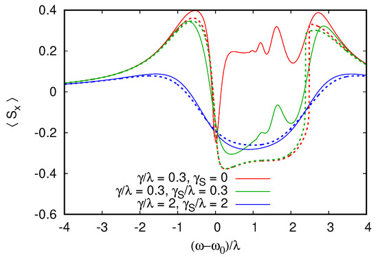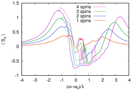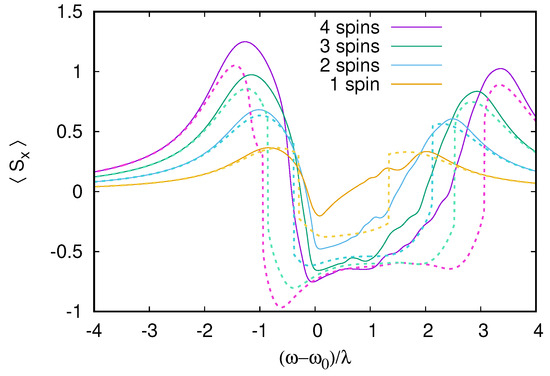 Figure 12). All the qubits in this simulation are detuned from each other, and without external driving, their in-plane magnetization will process at different frequencies, leading to an average cancellation of the total in-plane magnetization. When the cavity is driven, two synchronization peaks appear, where the total spin projection in the rotating frame