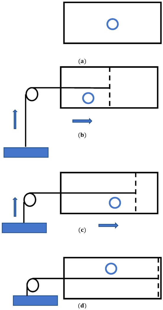 The Landauer principle may be understood in the context of the minimal thermal engine suggested by Leo Szilárd in 1929 [52]. Leo Szilárd is famous for his letter with Albert Einstein’s signature that resulted in the Manhattan Project. In Leo Szilárd’s original formulation, the engine exploits single-molecule gas confined in a box of volume contacting a thermal bath at temperature T, as depicted in Figure 3. As in any other thermal engine, the molecule/particle pushes the piston and the engine performs work (say, lifting a load, as shown in Figure 3b,c). Thus, the Szilárd energy transforms heat collected from the bath in the task, being the minimum thermal engine [52]. We are interested in the informational interpretation of the Szilárd engine, which is closely related to the Landauer principle.