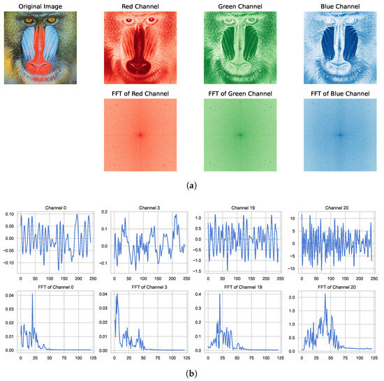 Comparison of images and vibration signals in different channels. (a) RGB channels of the image and their 2D FFT; (b) Multiple channels of vibration sensors and their FFT.