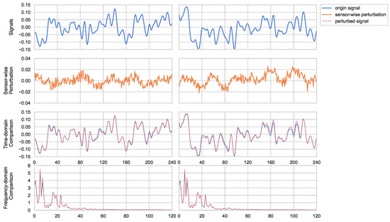 The advantage of sensor-wise perturbation lies in its ability to introduce variation to vibration-like signals. By perturbing the main frequency components of the signal based on the frequency characteristics of different sensor channels, sensor-wise perturbation ensures that these perturbations are reflected in the time domain while maintaining consistency in the spectral features. Such perturbation enhances the fit of the sample distribution for models trained with limited data, thereby improving the generalization capability of the model. Figure 2 provides an illustrative example of sensor-wise perturbation applied to a vibration signal, which can be seen to introduce variation in the signal while preserving its spectral features. The introduction of sensor-wise perturbations aligns with the intrinsic characteristics of fault diagnosis tasks. By perturbing the data at the sensor level, the model becomes more adept at capturing subtle variations in sensor readings that may indicate fault conditions. Furthermore, the channel-wise nature of the perturbations ensures that the model learns to differentiate between various sensor channels, enhancing its ability to pinpoint the source of anomalies. The introduction of data perturbations enhances the uncertainty in the model’s predictions, enabling it to focus on regions of the feature space with higher information gain and adapt to varying data distributions. This approach aligns with the requirements of fault diagnosis applications, where precise identification of sensor-specific deviations is crucial for accurate diagnosis and maintenance decisions.