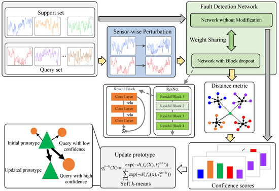 The overall framework of the proposed method is depicted in Figure 3. The monitoring signal samples are divided into a support set and a query set based on whether they have labels for the components’ conditions (normal or fault) in an episode, which represents a training cycle. The input samples are fed into the model through two pipelines to generate confidence scores. One pipeline involves feeding the original samples into the neural network without any model perturbation, while the other pipeline introduces model perturbation by randomly dropping the last residual block in the residual network and sensor-wise perturbation by adding sensor-wise perturbation to the entire data in the episode. The confidence scores from these two pipelines are then combined as inputs to the soft k-means algorithm for updating prototypes. The initial prototypes for both pipelines are derived by averaging the embeddings of the support set, which are then used to compute confidence scores for each space and class. Then, the prototypes for each space are updated using the ensemble confidence scores obtained from various spaces and queries. This updating process is repeated T times, with each update incorporating an averaged confidence. Finally, inference is performed based on .
