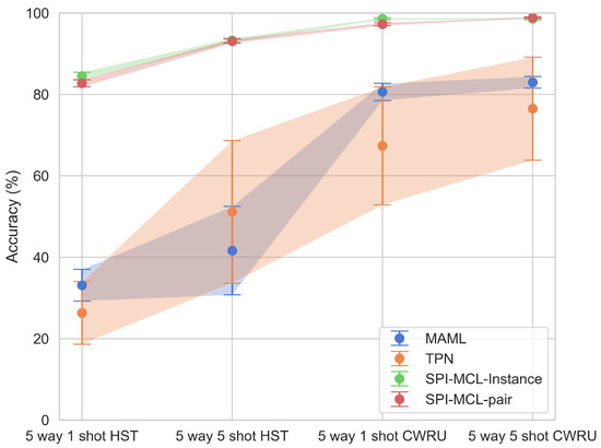 In this section, we conducted comparative experiments on a dataset containing faults in high-speed train suspension systems to evaluate the performance of the proposed SPI-MCL method. These experiments were meticulously designed to compare SPI-MCL with two state-of-the-art few-shot learning methods: Transductive Propagation Network (TPN) [15] and Model-Agnostic Meta-Learning (MAML) [13]. The terms “instance” and “pair” in the table represent instance-wise and pair-wise metric scaling, respectively, as defined in Equations (3) and (4). The backbone network used in the experiments was a ResNet12 network with one dimension convolutional layers and residual blocks, as detailed in Table 3, similar to the architecture used in [15,23,25]. The performance of these methods was evaluated across two distinct datasets: HST→ high-speed train suspension fault dataset and CWRU→ bearing dataset. The experimental settings included five-way classification with one-shot and five-shot scenarios, with the results presented in Table 4 and Figure 6 in which the shaded areas represent standard deviations of the results. The experimental results provide compelling evidence of the superior performance of the SPI-MCL method across all settings. Notably, both SPI-MCL-Instance and SPI-MCL-Pair consistently outperformed TPN and MAML in terms of classification accuracy across different shot numbers. Furthermore, the performance of SPI-MCL exhibited a positive correlation with the number of shots, indicating its capability to effectively leverage limited labeled data for fault diagnosis tasks. These results underscore the robustness and adaptability of the SPI-MCL method, even under conditions of limited labeled data.