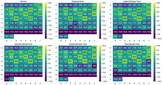 To visually illustrate the impact of sensor-wise perturbation on different signal channels across various fault categories, a subset of samples from selected fault categories is chosen here to demonstrate the energy distribution of sensor-wise perturbation across different channels. For a clearer presentation, the log-scaled energy of injected perturbation is computed, followed by the generation of a heatmap for all 58 channels, as shown in Figure 7. From the figure, it can be observed that the energy distribution of perturbation varies across different channels, indicating the variability of sensor-wise perturbation in handling signals from different channels.