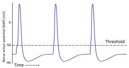 It was generally assumed that the NAP amplitude and shape are a constant for a particular neuron. The information is proportional to the number of impulses per unit of time, that is, to frequency. A stronger signal indicates more pulses and a weaker signal indicates fewer pulses, which means that frequency modulation is responsible for the transmission of information via nerve fibers. Signaling is binary, with NAP impulses being either “on” (if a threshold is exceeded) or “off” [28]. In [29], the process of converting information in the retina is modelled as an analog-to-digital convertor. Synapses were considered to be mere connectors, where transmission slows down as it is performed using chemical diffusion (similar to electrical connectors that attenuate the pulse energy).