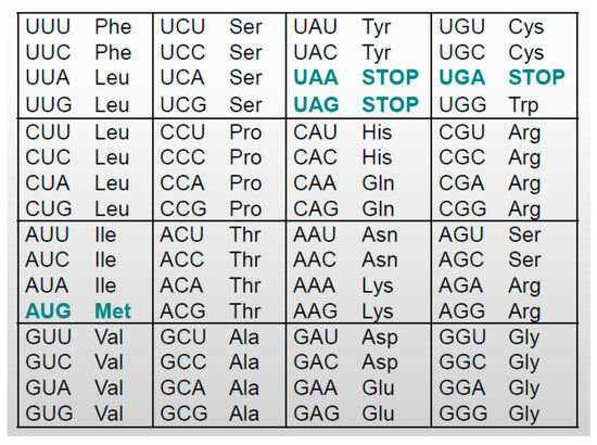 Nucleotides are organized in triplets called codons. There are 43 = 64 possible triplets, mapped into amino acids and into so-called “stop” or “nonsense” codons, according to Figure 2. A sequence of amino acids makes up a protein, which is a key factor in all processes in living beings. Information on each protein is written in segments of the DNA molecule. Those segments represent the gene for the given protein [36].