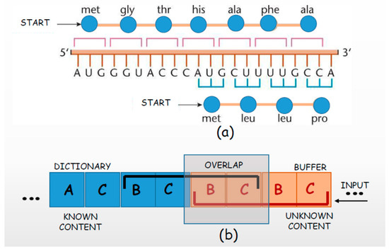 Non-destructive compression. (a) Two overlapping genes with differently synchronized codons; (b) overlapping the contents of dictionary and input buffer in the Ziv–Lempel 77 procedure.