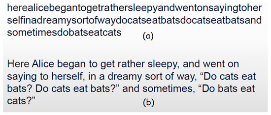 (a) Non-synchronized stream of digital symbols; (b) the same text with included blanks, capital letters, and punctuation marks to differentiate (synchronize) words and sentences by denoting their beginnings.