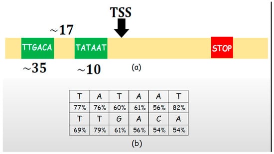 (a) Transcription start site (TSS) and markers TATAAT and TTGACA at the offset of approximately 10 and 35 positions from TSS; (b) probability that the nucleotide is at its expected position.