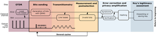 The main steps of the protocol are depicted in Figure 1. The protocol starts with the OTDR scan, but this time, the users no longer need to ensure that Eve is absent. The inferred reflectogram is compared with the initial one. If the users observe a significant alteration in the line’s reflectogram, the protocol must be terminated, and the corresponding region of the line must be inspected for a breach.
