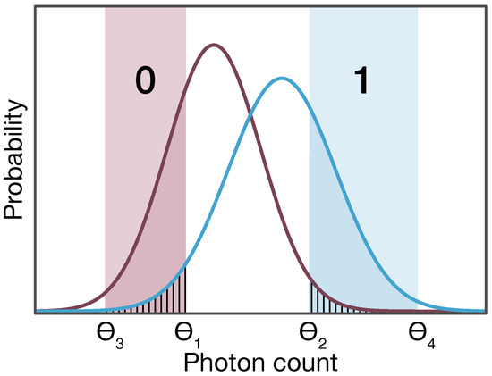 Example probability distributions of the measured photon numbers for bits 0 and 1 are illustrated in Figure 2. The postselection process involves discarding bit positions based on unsatisfactory measurement outcomes. If the measured photon number falls between the expected average photon numbers for the 0 and 1 pulses, assigning it to either bit becomes challenging. Consequently, the users take photon numbers between and as inconclusive and discard those bit positions. Conversely, if the photon number measured by Bob is either too low or too high—making it straightforward to assign it to either 0 or 1—Eve might also easily deduce what these states represent. As explained in Ref. [16], this occurs because the use of optical amplifiers introduces correlations between the states that may have potentially leaked to Eve and the states measured at Bob’s end. Therefore, the users must also discard bit positions corresponding to photon numbers below and above . Through this selective sifting of measurement results, the users generate the raw key.