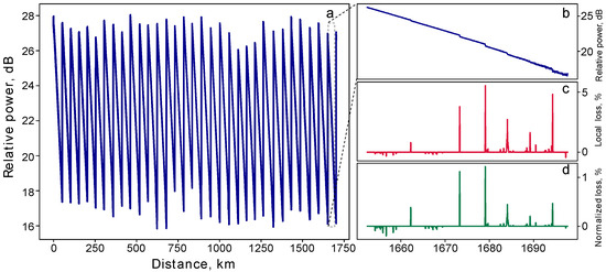 We now discuss in detail the experimental loss control for the 1707 km line, concentrating on the OTDR [20,21]. In telecommunications, the OTDR is typically only applied to the segments of the transmission line that do not contain amplifiers. This is because standard amplifiers include elements, like optical circulators, that prevent the return of backscattered light, making it not possible to analyze the line in its entirety. However, our BEDFAs, a schematic of which is depicted in Figure 3b, are designed without these elements. Figure 4a displays the experimentally obtained reflectogram for the entire 1707 km line, including 32 BEDFAs. The measurement, which took 180 s (including both the physical measurements and the computational processing of the obtained data), was conducted at a wavelength 1530 nm, with a probing-pulse duration of 200 ns, and averaging over 5000 pulses’ runs. The reflectogram exhibits a characteristic saw-like pattern. This indicates the sharp increases in backscattered power at each BEDFA, providing a visual map of their positions along the fiber.