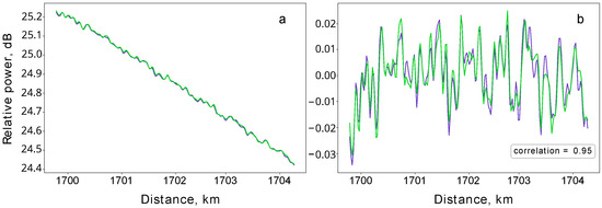 Figure 5a presents two independently obtained reflectograms of the 4 km long fiber section at the end of the line. In turn, Figure 5b depicts the corresponding profiles obtained from the reflectograms by subtracting the linear components. Remarkably, the traces corresponding to the independent OTDR measurements exhibit identical patterns with a correlation coefficient of 0.95. This confirms that the observed features are not mere noise but are, in fact, unique patterns due to the amorphous structure of the silica fiber. Considering the significant distance of over 1700 km from the reflectometer, the consistency in replicating this pattern is highly notable. As the silica amorphous structure cannot be replicated, the observed distinctive pattern is a physically unclonable function [28,29,30,31]. Any physical tampering with the line would, thus, alter its characteristic ‘fingerprint’. With the BEDFAs maintaining the initial power levels of both the OTDR probing pulse and its backscattered components across the line, we can, thus, verify this unique ‘fingerprint’ and check the integrity of the fiber over the entire 1707 km line [22].