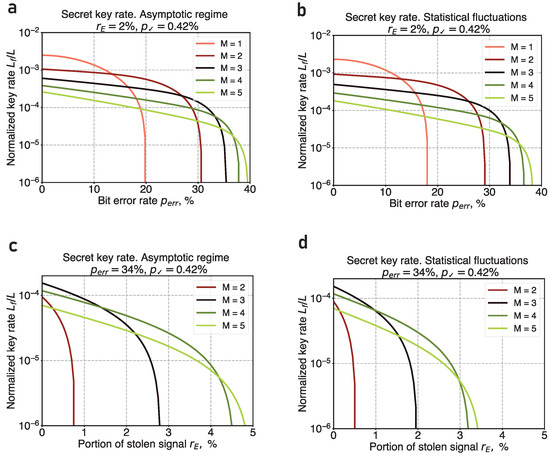 Secret key generation rate as a function of the observed parameters for different values of the block’s length M. We take that Eve is located right after Alice’s side, and the probability of a conclusive bit measurement result is p✓ = 0.42%. (a) Key rate dependence on BER (), asymptotic limit. (b) Key rate dependence on BER (), the statistical fluctuations are taken into account. (c) Key rate dependence on (), asymptotic limit. (d) Key rate dependence on (), the statistical fluctuations are taken into account.