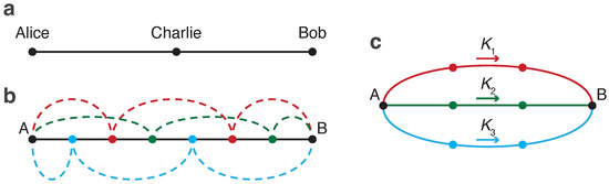 While it is feasible for the sender to transmit the key directly to the recipient, bypassing all intermediate nodes, this approach may not always be viable due to the decrease in the key rate with increasing distance. Therefore, instead of bypassing all intermediate users, it may be more advantageous to bypass only some of them. The others would then act as trusted nodes, measuring the signal and resending it; we will refer to these users as reproducers. In this scenario, the sender and recipient may employ the secret sharing scheme [47,48,49]. Consider the one-dimensional network depicted in Figure 8b. Within this user chain, three different initial keys, , , are , are distributed via different sets of reproducers, marked as red, green, or blue. By controlling leakages across the entire line—either collectively or through some central entity that does not have access to the keys themselves—it is ensured that only the designated group of reproducers handles a specific initial key. Thus, while each group of reproducers knows their respective , they lack knowledge of the other initial keys. The final key, K, is composed of all initial keys (e.g., through a hashing algorithm, ) and remains unknown to any of the reproducers. The introduced control mechanism effectively increases the connectivity of the QCKD network: what was initially a simple one-dimensional user chain in Figure 8b becomes equivalent to a more interconnected network with multiple branches, as illustrated in Figure 8c.