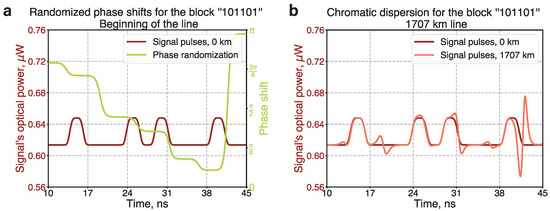 In the case of phase randomization, chromatic dispersion significantly alters the temporal shapes of propagating pulses. We conduct numerical simulations to examine the evolution of bit-encoding wave packets for a representative sequence of phase-randomized pulses. Figure 9a illustrates the temporal profile of optical pulses corresponding to the bit sequence ‘101101’ and randomized phase shifts. The amplitude of the initial signal is multiplied by a phase factor determined by the green curve. After propagating through the whole 1707 km line, the shapes of the pulses are altered at moments corresponding to the phase shift switching, as shown in Figure 9b. However, the total number of photons (or energy) in each pulse remains constant.